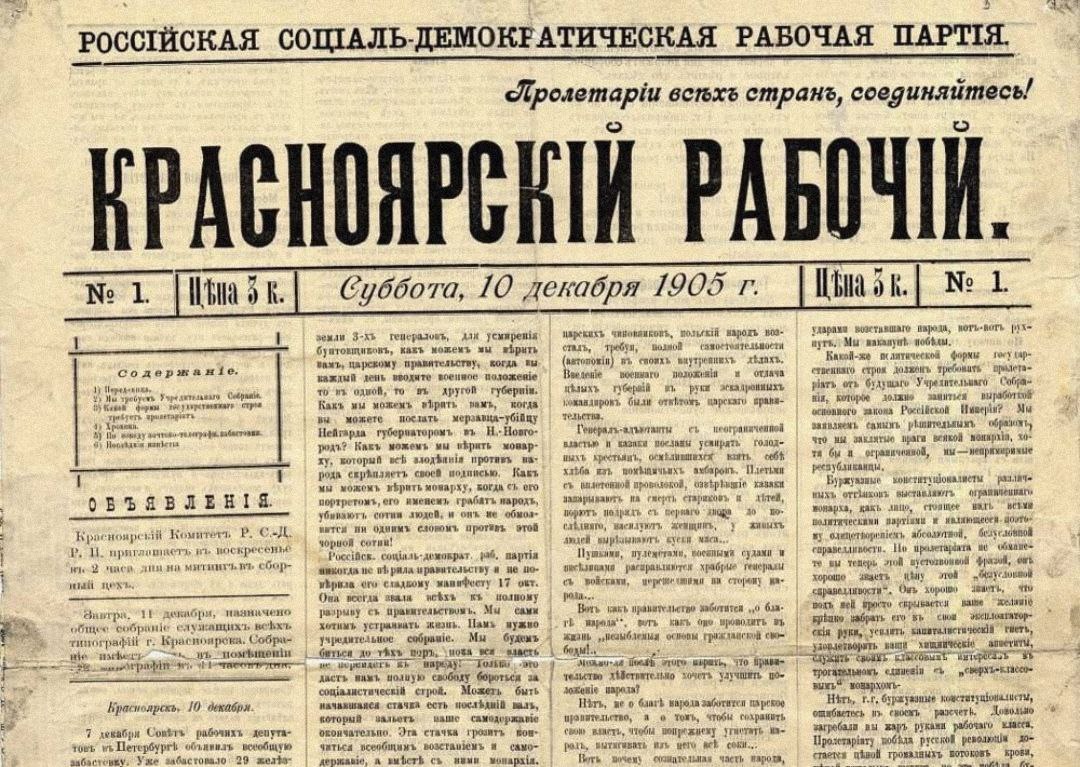 Сегодня исполнилось 120 лет со дня выхода первого номера газеты «Красноярский рабочий». Он увидел свет 10 декабря 1905 года, но это по старому стилю. По новому выпадает на 23 декабря. Так мы отмечали день рождения — и сотрудники редакции, и читатели — многие и многие годы. Традиция.